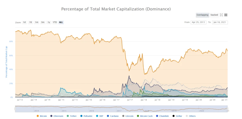 Dieser Trend spiegelt sich auch in der Bitcoin-Dominanz, also dem Anteil des Bitcoin an der Marktkapitalisierung des gesamten Kryptomarkts, wieder. Seit dem Tief im Januar 2018 hat sich die Kennzahl zuletzt wieder auf 66 Prozent verdoppelt. Bitcoin und Ethereum auf Rang 2 machen zusammen rund 80 Prozent des Gesamtmarkts aus.