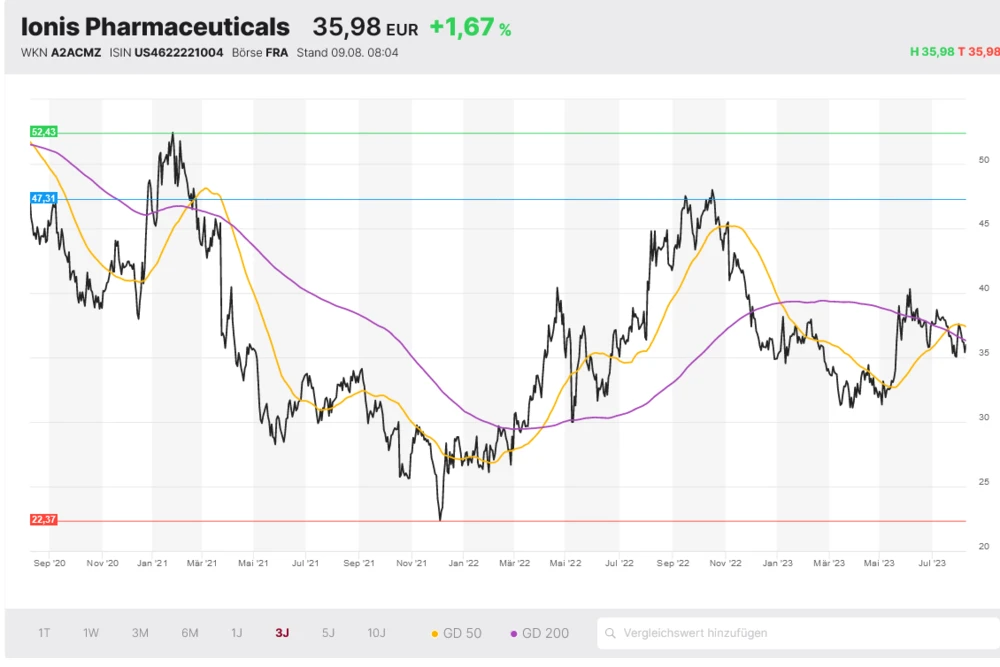 Der Konzern bestätigt die Prognose für das Gesamtjahr, dabei sieht sich das Unternehmen mit seinen acht Medikamenten in der Spätphase gut gerüstet. Für das zweite Halbjahr erwartet die Konzernleitung eine positive Dynamik einschließlich der Phase-3-Ergebnisse für Olezarsen bei familiärem Chylomikronämie-Syndrom, einer lebensbedrohenden Krankheit, die den Körper am Verdauen von Fetten hindert. Ionis geht ferner davon aus, im Dezember die Zulassung für das gemeinsam mit AstraZeneca entwickelte Medikament Eplontersen gegen Amyolid-Transthyretin (ATTR) zu bekommen. Bei ATTR handelt es sich um eine Krankheit, die vornehmlich das Herz und das periphere Nervensystem angreifen.