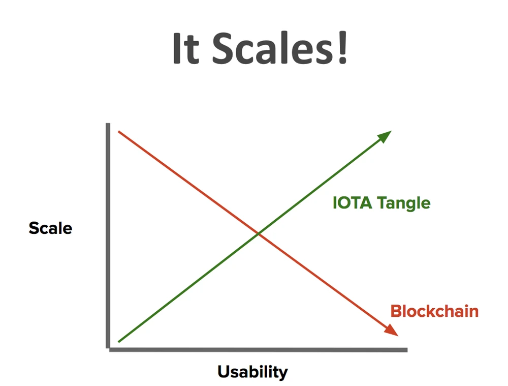 Im Bitcoin-System gibt es die Nutzer, welche Coins transferieren, und die Miner, die Transaktionen bestätigen und dafür entlohnt werden. Dieses System stößt derzeit durch den großen Hype und die damit verbundene Belastung der Blockchain, deren Blöcke eine begrenzte Speicherkapazität haben, an seine Grenzen. Transaktionen werden teilweise erst nach Stunden durchgeführt und kosten bis zu 30 Dollar. IOTA löst dieses Skalierungsproblem mit der Tangle-Technologie, indem Nutzer und Miner verknüpft werden. Um eine Transaktion durchführen zu können, müssen vorerst mindestens zwei vorherige bestätigt und verifiziert werden. Dadurch entsteht der sogenannte Tangle, wie er im Folgenden vereinfacht dargestellt ist (Bilderquelle: www.blog.iota.org)