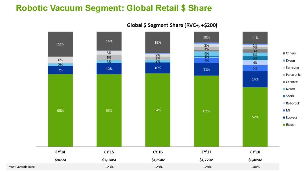 Zuletzt musste iRobot gerade an die asiatische Konkurrenz Marktanteile im nach wie vor stark wachsenden Markt abgeben. Im Jahr 2018 kam iRobot noch auf einen Anteil von etwa 52 Prozent.