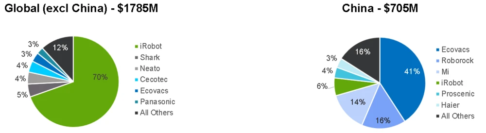 Dass der Druck vor allem von Ecovacs und anderen asiatischen Herstellern ausgeht, zeigt die Verteilung der Marktanteile in China und außerhalb. Dort ist Ecovacs mit Abstand die Nummer 1, iRobot hingegen kommt auf einen mageren Anteil von lediglich sechs Prozent.
