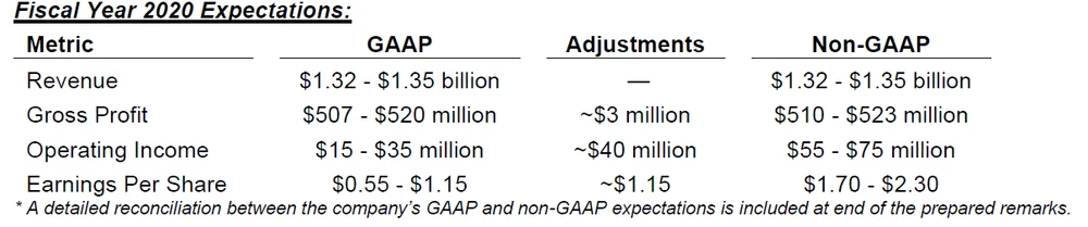 Für das Fiskaljahr 2020 erwartet das Unternehmen einen Umsatz von 1,33 bis 1,35 Milliarden Dollar und ein EPS-Ergebnis von 0,55 bis 1,15 Dollar.