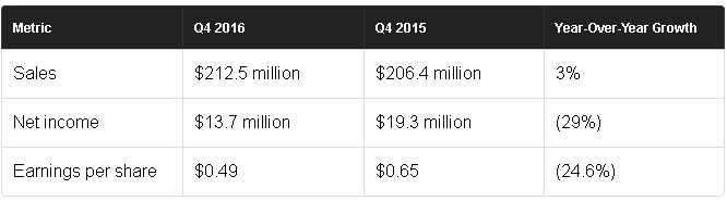 Im Gesamtjahr beliefen sich die Umsätze auf 660,6 Millionen Dollar und der Gewinn pro Papier lag mit 1,48 Dollar nur knapp über dem Vorjahreswert. (EPS 2015: 1,47 Dollar).