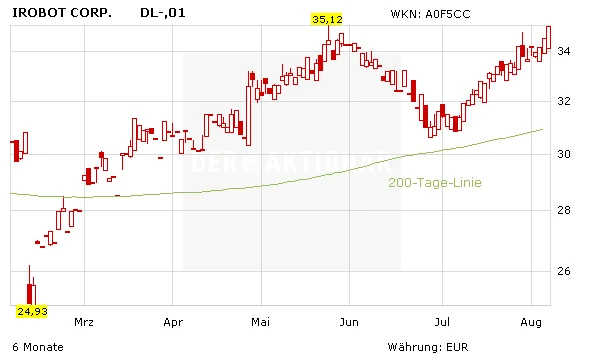 Nachdem im Mai ein neues Jahreshoch markiert wurde und die Aktie in eine Konsolidierung übergegangen ist, befindet sich iRobot wieder im Aufwind und attackiert die alten Hochs. Die derzeitige Marktkapitalisierung beträgt 950 Millionen Euro bei einem KGV von 20 im Jahr 2017. Nur für Mutige!