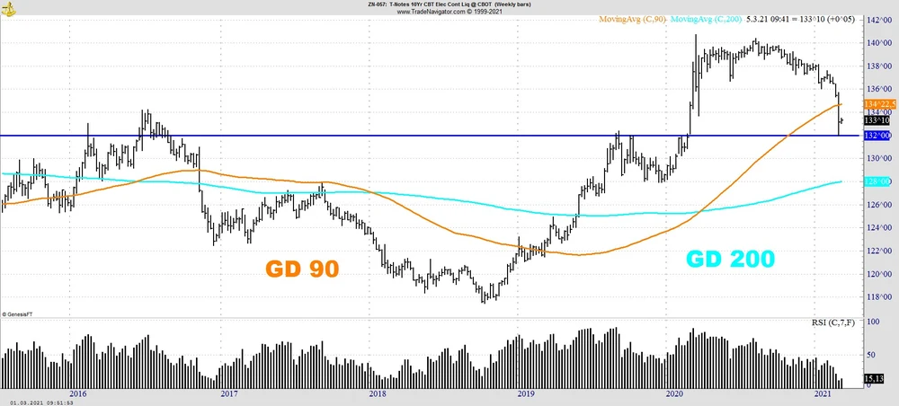 Nach dem rasanten Zinsanstieg der letzten Woche scheint sich die Lage bei den 10-jährigen US Treasury Anleihen wieder etwas beruhigt zu haben. Im August 2020 notierte der Future für 10-jährige T-Notes im High bei 138 26/32, was einer Rendite von 0,51 Prozent entsprach. Der seitdem bestehende Abwärtstrend beschleunigte sich nach dem Bruch der wichtigen Unterstützungszone im Bereich von 134 20/32 am 16. Februar 2021, was einer Rendite von 1,2 Prozent entsprach.
