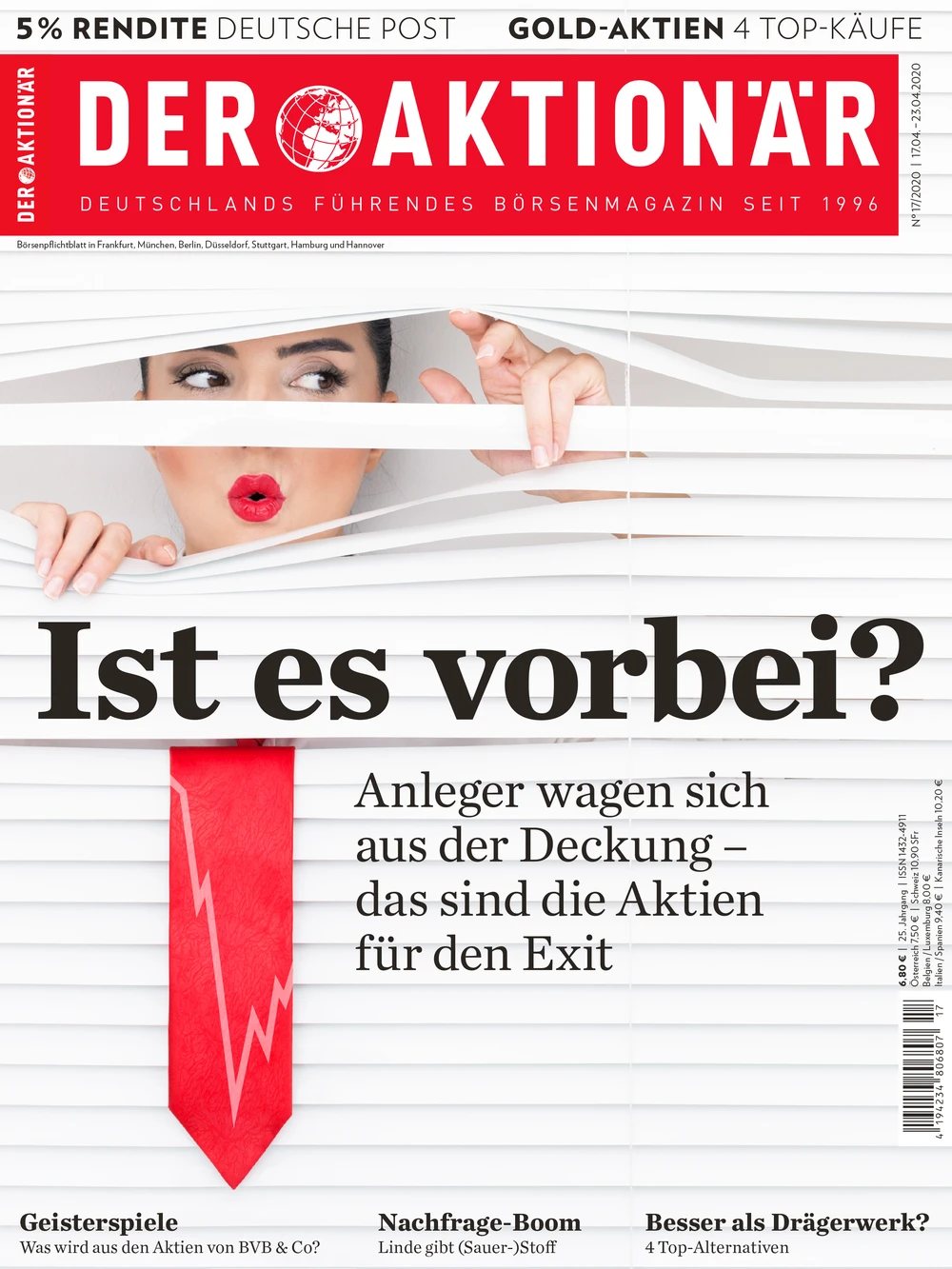Sind die März-Tiefs bereits Geschichte und stehen wir vor einer v-förmigen Erholung oder muss das rechte Bein für einen doppelten Boden noch nachgezogen werden? Die Redaktion blickt in der aktuellen Ausgabe in die Zukunft und stellt ausgewählte Titel vor, deren Chance-Risiko-Verhältnis aufgrund der aktuellen Situation extrem vorteilhaft ist. Anleger können in der aktuellen Situation mit der richtigen Aktienauswahl den Grundstein für einen nachhaltigen Vermögensaufbau legen. Dabei hilft DER AKTIONÄR.