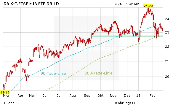 Langfristige Anleger lassen sich nicht von den politischen Risiken abschrecken und bleiben im vom AKTIONÄR empfohlenen db x-trackers FTSE MIB ETF investiert. Der Indexfonds bietet Anlegern eine kostengünstige Möglichkeit (TER 0,20 Prozent) an der wirtschaftlichen Erholung Italiens teilzuhaben.