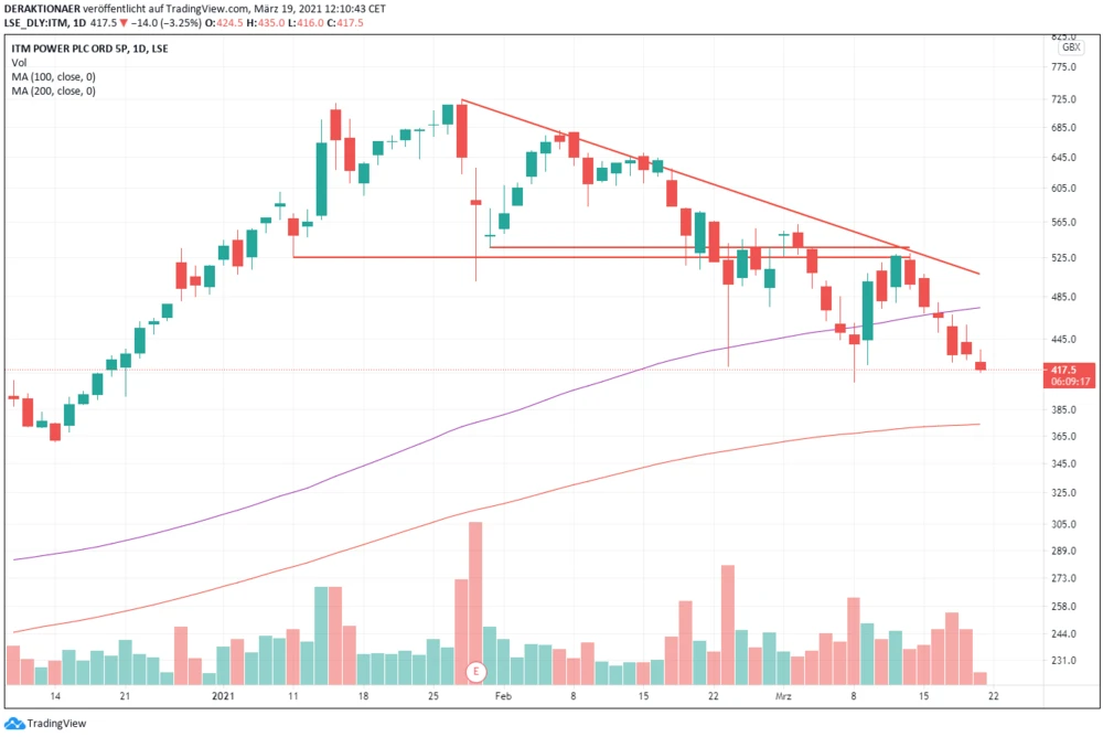 Noch in der letzten Handelswoche sah es bei der ITM-Power-Aktie dank einer starken Erholungsbewegung wieder deutlich besser aus. Jedoch prallte der Kurs an der massiven Widerstandszone bei 525 und 536 Pence ab und ging daraufhin wieder auf Talfahrt.