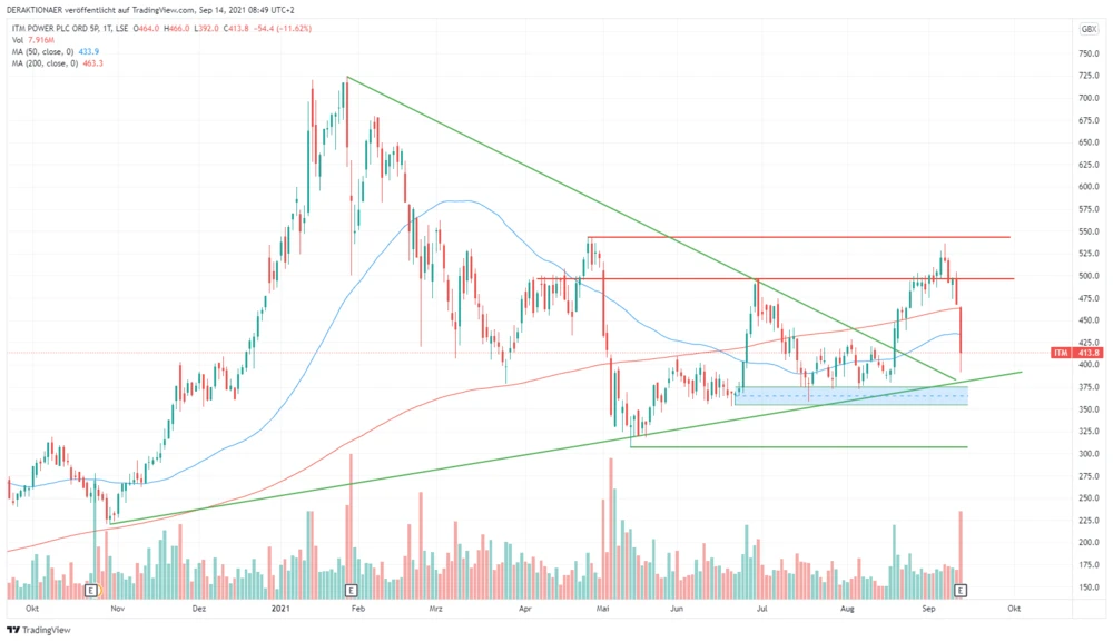 Nachdem der starke Wasserstoff-Hype zum Jahreswechsel abschwächte, konsolidierte die ITM-Power-Aktie in Form eines sehr breiten Dreiecks. Dieses spannte sich am Zwischentief bei 220,60 Pence und am Rekordhoch bei 724,00 Pence auf. Mitte August löste der Kurs diese Formation bei 415 Pence nach oben auf und generierte damit ein Kaufsignal. Nachdem er sich immer weiter Richtung Norden vorkämpfte und dabei die Hürden an der 200-Tage-Linie bei 449 Pence und der Horizontalen bei 500 Pence knackte, prallte er knapp unter dem Widerstand am April-Hoch bei 543 Pence ab.