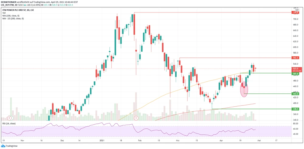 Die Einschätzung wurde bestätigt und die ITM-Power-Aktie meisterte im Wochenverlauf den Ausbruch. Damit hat der Titel die entscheidende Marke von 500 Pence hinter sich gelassen. Der Abwärtstrend ist dadurch definitive beendet und es ergibt sich eine neue Chartkonstellation. Die Aktie ist nun auf dem Weg zum nächsten Widerstand bei 562 Pence. Aktuell hat der Kurs auch bereits den GD100 bei 515 Pence hinter sich gelassen.