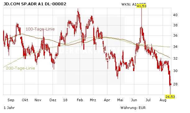 Im sich beschleunigten Abwärtstrend hat die Aktie von JD.com den Stopp bei 29,00 Euro erreicht. DER AKTIONÄR bleibt langfristig von JD.com und vom anhaltenden Wachstum im chinesischen Online-Handel überzeugt, rät angesichts der schwierigen Situation am chinesischen Markt trotz günstiger Preise aktuell jedoch zum Verkauf. Denn mittelfristig sind keine neuen Impulse für eine Trendwende zu erwarten.