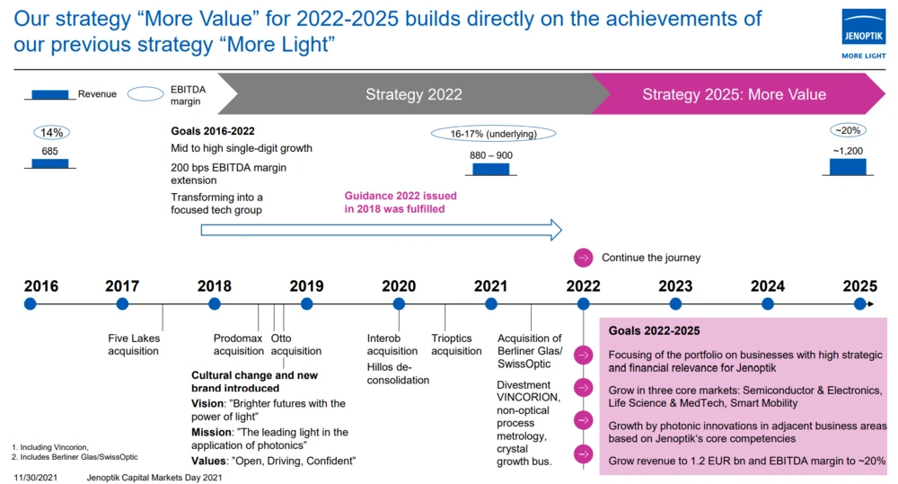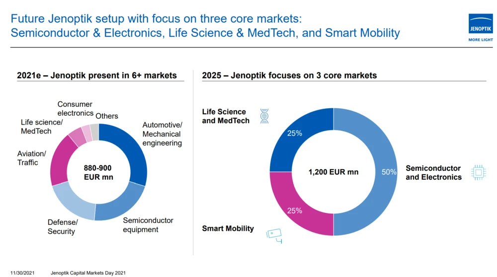 Jenoptik will das Portfolio auf Geschäfte "mit hoher strategischer und finanzieller Relevanz" fokussieren. Zum Erreichen seiner Ziele konzentriert sich der Konzern zum einen auf das Wachstum in den Bereichen Halbleiter und Elektronik, die für die Hälfte der 2025er-Umsätze stehen sollen. Der Fokus soll aber auch auf den Kernmärkten Medizintechnik, Biowissenschaften (Life Science) und Smart Mobility liegen.