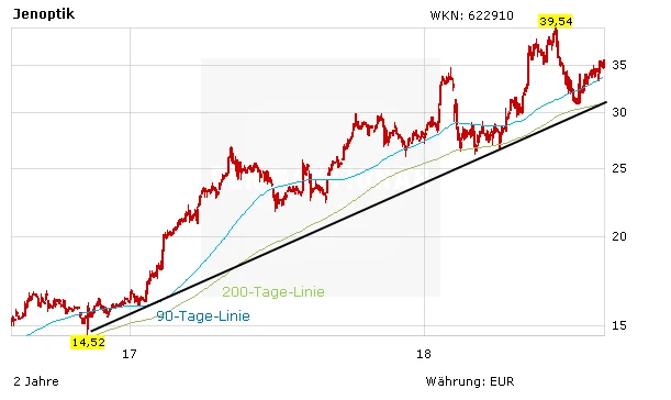 Um das Wachstum muss sich der Jenoptik-Chef beim Aktienkurs aber keine Sorgen machen. Für Anleger stellen sich die Papiere des Technologiekonzerns als richtiger Glücksgriff heraus. Mit einem Plus von derzeit rund 25 Prozent seit Jahresanfang hat sich die Aktie prächtig entwickelt – auf Zweijahressicht verdoppelte sich die Aktie sogar. Zwischenzeitlich konnte Jenoptik ein neues Allzeithoch bei 39,54 Euro markieren.