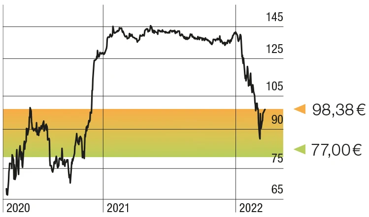 Die Aktien, über die Sie in der Titelstory lesen werden, sind prinzipiell jetzt – was Bewertung und Investmentstory betrifft – alle ein Kauf. Aber: Da die Lage an den Märkten weiterhin unsicher und die Volatilität groß ist, empfiehlt es sich, zunächst eine halbe Position aufzubauen. Die zweite Position kann man abstauben, sollte es noch einmal ungemütlich werden an der Börse. Die eingezeichnete Zone im Chart besagt: Je grüner der Bereich, desto kaufenswerter die Aktie. Am unteren Rand der Kaufzone sollten Anleger entsprechend ein Kauflimit platzieren, um die Position dort zu komplettieren.