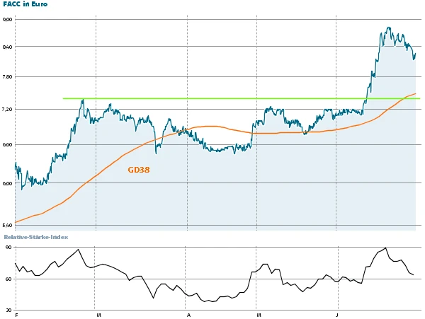 Die FACC-Aktie hat wie erwartet nach dem starken Kursanstieg der letzten Wochen etwas korrigiert. Im Zuge dessen hat der in Ausgabe 26/2017 empfohlene Turbo-Optionsschein mit der WKN RC0LS8 das angegebene Kauflimit von 0,35 Euro erreicht. Der Stoppkurs wird bei 28 Cent platziert.