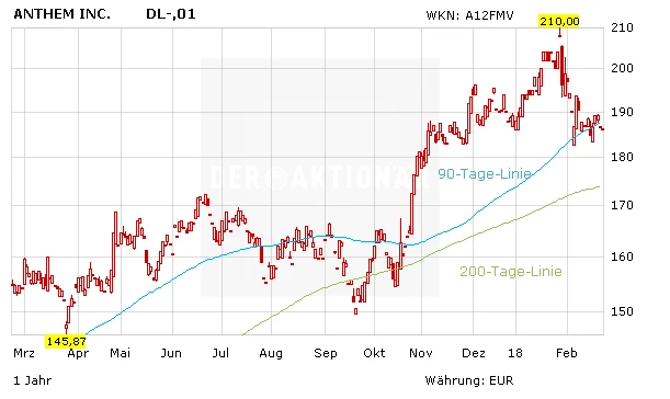 Der große Konkurrent in Form von Amazon, Berkshire und JPMorgan ist nur in Planung und sollte 2018 keine Auswirkungen auf die stabile Bilanz von Anthem haben. Bei einem 18er-KGV von 16 gilt die Aktie als günstig bewertet. Zugreifen zum Schnäppchenpreis – das Kursziel liegt bei 224,00 Euro.