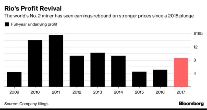 Im Zuge der erfreulichen Ergebnisentwicklung hat CEO Jean-Sebastien Jacques nun angekündigt, dass die Ausschüttungsquote auf knapp 70 Prozent klettern soll. So werden die Anteilseigner für das Gesamtjahr 2017 eine Dividende von 2,90 Dollar erhalten – mehr als die Marktteilnehmer bisher erwartet hatten. Nachdem im Herbst bereits knapp 1,10 Dollar ausgeschüttet wurden, dürften sich die Aktionäre im April auf weitere 1,80 Dollar je Anteilschein freuen (Ex-Tag hierfür ist der 1. März, Anleger müssten die Aktie also spätestens am 28. Februar kaufen, um in den Genuss der Auszahlung zu kommen). Für den Herbst rechnen Analysten zudem mit einer Halbjahresdividende von knapp einem Dollar, womöglich übertrifft Rio Tinto dann aber auch erneut die Dividendenschätzungen der Experten.
