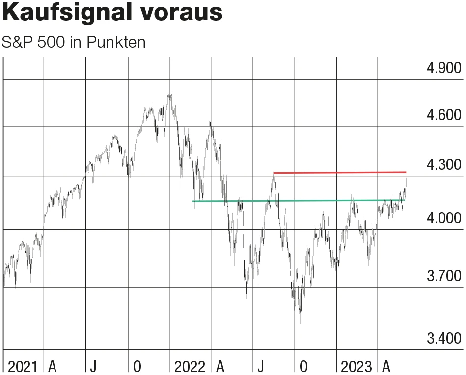 Auch 2023 gibt es mehrere Risiken. Hohe Inflation und Zinsen, die Wirtschaft am Rand der Rezession (oder mittendrin), zunehmende Spannungen zwischen den USA und China. Und trotzdem läuft es an der Börse so richtig gut. 11,5 Prozent ist der S&P 500 seit Jahresbeginn gestiegen, was sechs Prozentpunkte über der durchschnittlichen Jahresrendite seit 2000 liegt. In der vergangenen Woche ist der Index auf den höchsten Stand seit August geklettert. Gelingt das Break über die Marke von 4.325 Punkten, wäre dies ein starkes Kaufsignal.