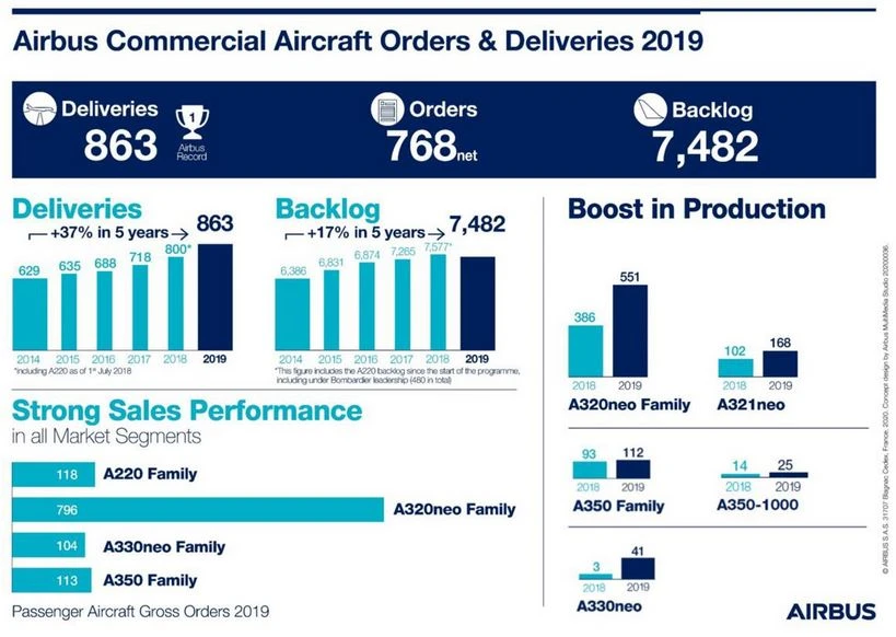 Auch Airbus konnte sein ursprüngliches Auslieferungsziel 2019 nicht halten. Eigentlich wollte der Konzern 880 bis 890 Verkehrsmaschinen ausliefern, strich den Plan aber später auf rund 860 Maschinen zusammen. Grund dafür war die neue Kabinenausstattung des Airbus A321neo, der Langversion der A320neo. Der Einbau der Kabine erfordert deutlich mehr Zeit als zuvor gedacht.