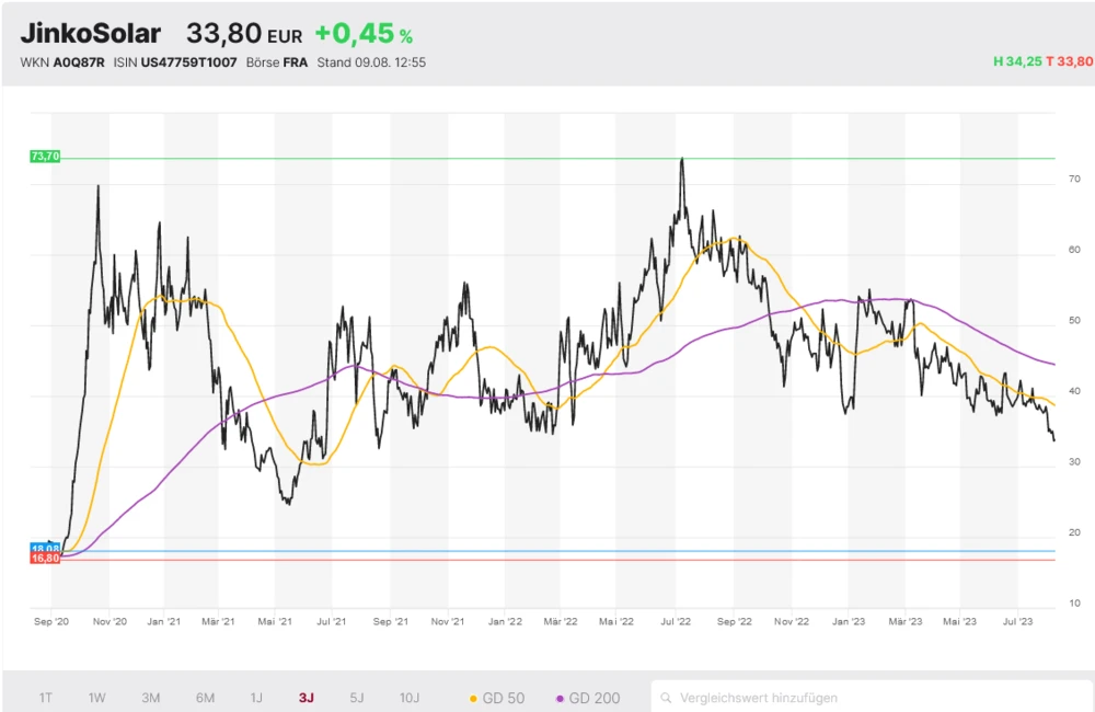 Aufgrund schlechter Unternehmensergebnisse in der Solarbranche, machen Anleger derzeit einen großen Bogen um Solaraktien. Davon ebenfalls nicht verschont ist JinkoSolar. Die Aktie markierte jüngst ein neues Jahrestief. Nächste Woche wird es spannend, hier planen die Chinesen Unternehmenszahlen zum zweiten Quartal vorzulegen.