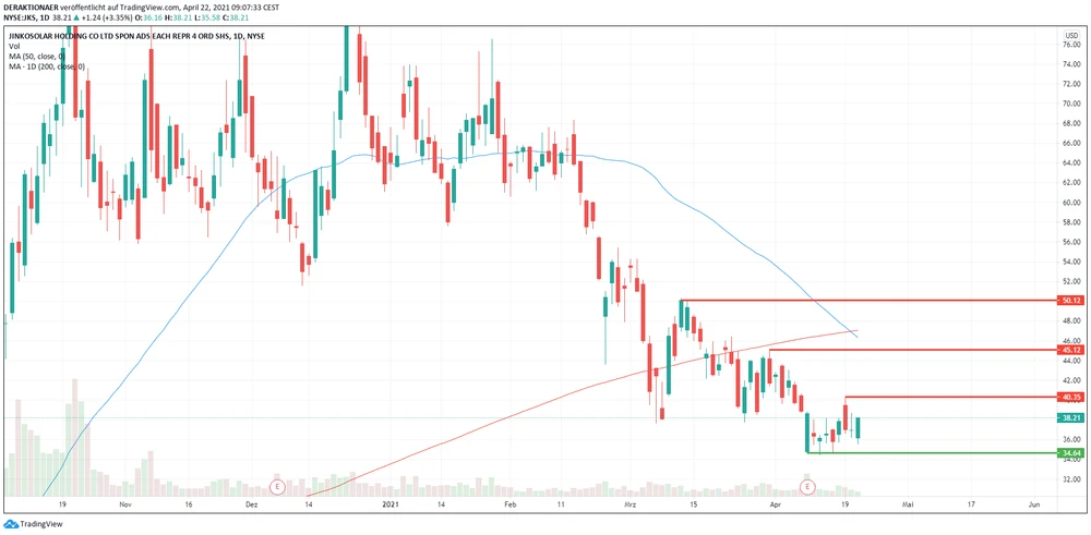 Die JinkoSolar-Aktie verließ die lange Seitwärtsphase Mitte Februar nach unten. Der Kurs gab daraufhin um rund 40 Prozent nach. Anfang März stoppte die Talfahrt dann auf einen Schlag bei 37,68 Dollar. Die Aktie legte eine 180-Grad-Drehung auf das Parkett und erholte sich in wenigen Tagen um über 30 Prozent bis an die psychologisch wichtige 50-Dollar-Marke. Das Niveau konnte allerdings nicht gehalten werden und in den nächsten Wochen ging es wieder abwärts. Mit den schlechten Quartalszahlen am 9. April fiel die Aktie auf ein neues Mehrmonatstief bei 34,64 Dollar. Von diesem Punkt aus erholte sich der Kurs langsam, damit fungiert das Tief als aktuelle Unterstützung.