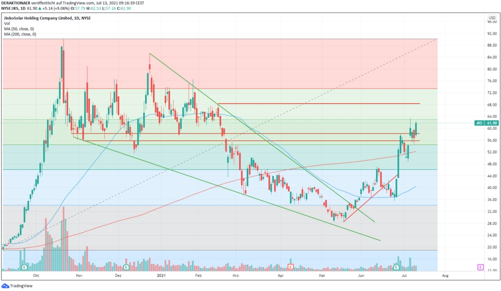 Die JinkoSolar-Aktie hat eine enorm steile Erholung hingelegt. Mitte Mai kam es dabei an der mittelfristigen Abwärtstrendlinie bei rund 28,30 Dollar zu einem Rebound. Kurz darauf löste sie eine abfallende Keilformation nach oben auf und legte bis heute um über 115 Prozent zu.