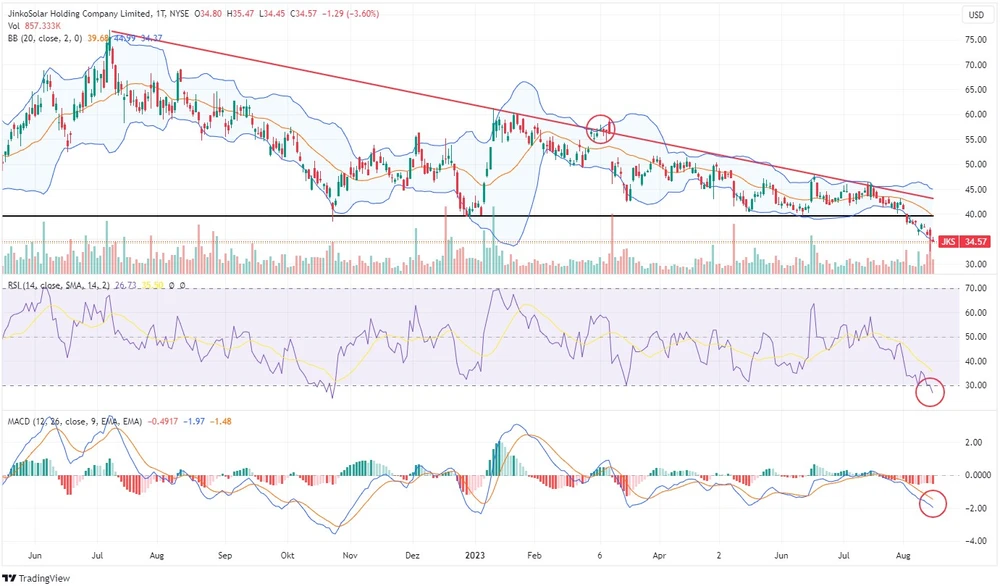 Seit mehr als einem Jahr befinden sich die Papiere des chinesischen Solarmodulherstellers JinkoSolar im Sinkflug. Erst vor Kurzem wurde eine wichtige Unterstützung aufgegeben, die auch mithilfe starker Quartalszahlen nicht zurückerobert werden konnten. Brechen jetzt alle Dämme?