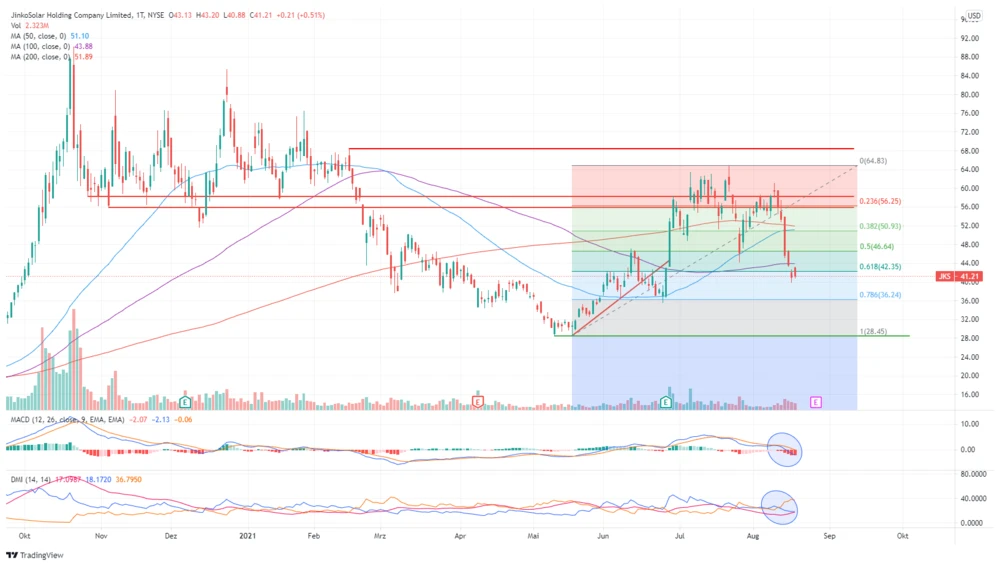 In der letzten Woche ist die JinkoSolar-Aktie wieder unter die Unterstützungszone, die von den Zwischentiefs bei 55,82 und 58,23 Dollar ausgeht, gefallen. Nach einem erneuten Kursrutscher Ende Juli konnte diese erst vor Kurzem mühselig zurückerobert werden.