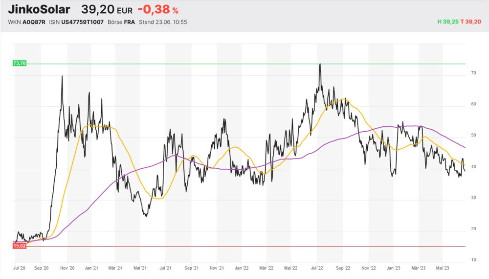 Die charttechnische Situation bei JinkoSolar ist weiterhin sehr angespannt. Seit Anfang Juli hat die Aktie mehr als 40 Prozent verloren und befindet sich seitdem in einem klaren Abwärtstrend. Sollte die Unterstützung bei rund 35 Euro nicht halten, drohen weitere Kursverluste. Mit einem KGV 6 zum Geschäftsjahr 2024 ist die Aktie attraktiv bewertet. Sollte die Europastrategie greifen, dürften langfrisitg höhere Kurse durchaus realistisch sein.