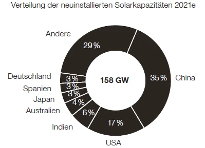Mit einem starken Wahlergebnis der Grünen dürften die Ambitionen Deutschlands bei Erneuerbaren Energien noch einmal zunehmen. Die Grafik zeigt zwar, dass der deutsche Markt im Vergleich etwa zu China oder den USA sehr gering ist. Neben Spanien ist Deutschland aber dennoch der wichtigste Solarmarkt in Europa. Hinzu kommt, dass ein „Grün-Rutsch“ des Big Players Deutschland auch eine hohe Symbolkraft hätte.