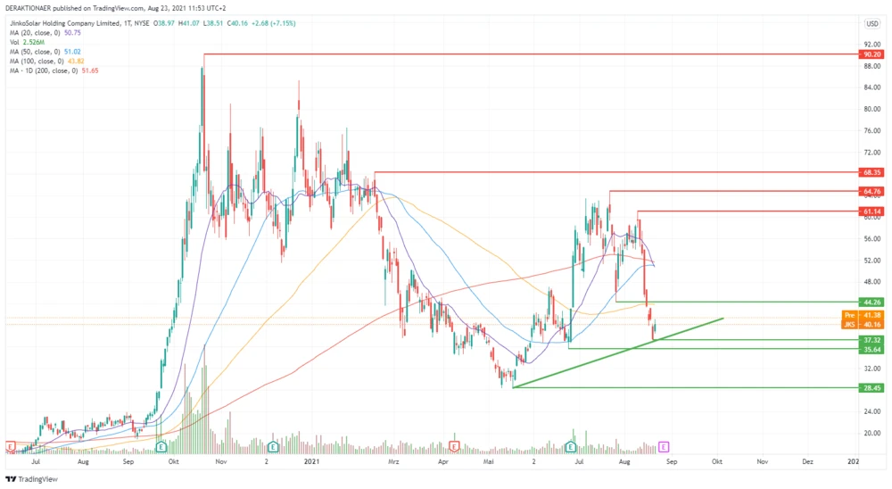 Die Aktie des chinesischen Solarmodulherstellers JinkoSolar ist in den letzten zwei Wochen stark eingebrochen. Der Titel notiert jetzt an einer wichtigen technischen Marke. Für Anleger stellt sich die Frage: jetzt Einsteigen oder Finger weg? DER AKTIONÄR ordnet die aktuelle Lage ein.