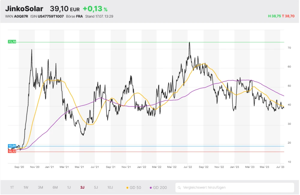 JinkoSolar hält derzeit knapp 59 Prozent der Anteile an Jiangxi Jinko und bedeutet, dass die ausgezeichneten Ergebnisse von Jiangxi Jinko einen direkten Einfluss auf die Gesamtleistung von JinkoSolar haben. An der Börse wurde dieser Umstand allerdings vollkommen ignoriert. In den USA beendete JinkoSolar den Handel mit einem Minus von etwas mehr als zwei Prozent.