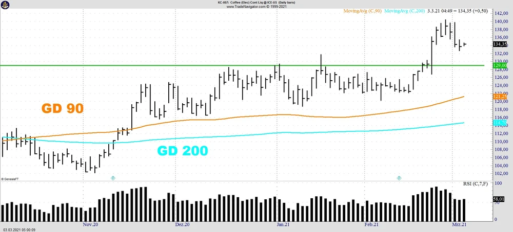 Kaffee kommt nach seinem knapp 10 prozentigen Anstieg seit Mitte Februar wieder etwas zur Ruhe und versucht einen neuen Boden im Bereich von 133 US-Cent zu finden. Hauptgrund für die starke Bewegung nach oben und den Ausbruch aus der alten Trading-Range war die Aussicht auf eine um 30 Prozent niedrigere Kaffee-Ernte für 2021/22. Langfristig stehen somit die Ampeln auf Grün, die Aussicht auf weitere Lockerungen der Corona Restriktionen und damit verbundene Kaffee und Restaurant Öffnungen sollten das positive Momentum unterstützen. Amerikanische Kaffee-Röster erwägen aufgrund stark gestiegener Transportkosten die Kaffee-Preise zu erhöhen, die USA sind weltweit der größte Kaffeeverbraucher.