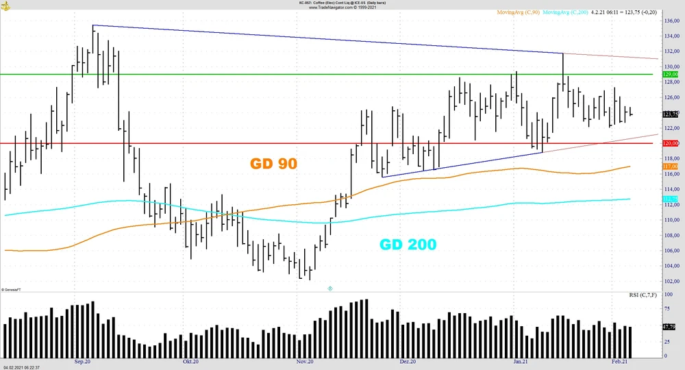 Gestern veröffentlichte die Internationale Coffee Organization (IOC) die Schätzungen für die globale Produktion der Erntesaison 2020/21 (Oktober bis September)und geht von einer Steigerung um 5.26 Millionen Säcke (á 60 kg) auf 171,89 Millionen für das gesamte Jahr aus, was einer Steigerung um 1,9 Prozent auf Jahressicht bedeuten würde. Durch die anhaltenden Lockdown-Maßnahmen ist eine Erholung der Nachfrage limitiert, die globale Erholung der Wirtschaft kommt nur sehr langsam voran, was die Kursphantasie nach oben zusätzlich begrenzt. Der brasilianische Real hingegen scheint seinen Abwärtstrend gestoppt zu haben und konnte gestern gegenüber dem US-Dollar knapp 1,5 Prozent zulegen, was den Kaffee-Preis aktuell unterstützt. Der März Kontrakt im Kaffee handelt aktuell um die kurzfristigen Moving Averages und läuft in ein Dreieck, aus dem er in den nächsten Tagen voraussichtlich ausbrechen wird. Schlusskurse über 129 oder unter 120 US-Cent werden über die weitere Richtung entscheiden.