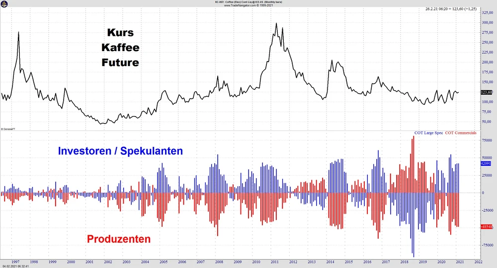 Die Produzenten sind eindeutig Short positioniert, die Funds halten mit einer relativ großen Long Position dagegen. Saisonal bedingt könnte der Kurs bis Juni leicht steigen.