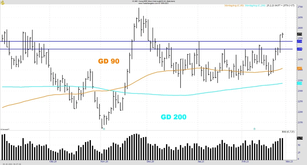 Starke Bewegungen im Kakao: Innerhalb von eineinhalb Wochen gab es zuerst ein falsches Break-Out nach unten, seit dem 19. Februar ging es dann aber nur noch aufwärts und der Future testete erneut die alten Hochs vom November/Dezember des vergangenen Jahres. Der Grund für den starken Anstieg liegt unter anderem in der Erwartung einer verbesserten Nachfrage aufgrund von Lockerungen der COVID-19 Maßnahmen.