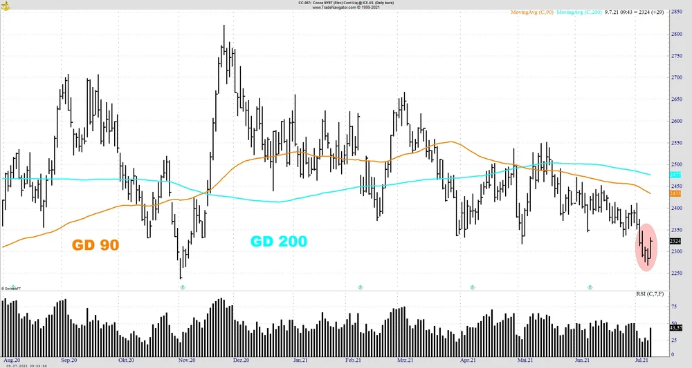 Ghana und die Elfenbeinküste sind für circa 60 Prozent der weltweiten Kakaoproduktion verantwortlich, bereits im Frühjahr begannen Spekulationen über ein höher als erwartete Ernte. Das drückt den Kakaopreis. Erschwerend kommt der aktuell schwache Euro gegenüber dem US-Dollar hinzu, ein schwacher Euro ist Gift für die Rohstoffmärkte. Mit dem Unterschreiten der wichtigen 2.350-Dollar-Marke auf Schlusskursbasis wurde der Weg für eine weitere Talfahrt geebnet. Allerdings ist der Markt technisch gesehen aktuell über verkauft. Mit einer Gegenbewegung muss also jederzeit gerechnet werden.
