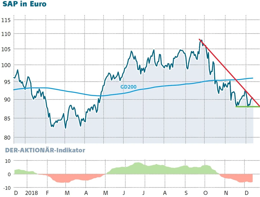 Im Chart von SAP machen sich dagegen erste Anzeichen einer Erholung bemerkbar. Im Bereich von 88 Euro scheint die Aktie einen ersten Boden gefunden zu haben. Der Abwärtstrend bleibt jedoch intakt. DER AKTIONÄR bleibt long dabei.