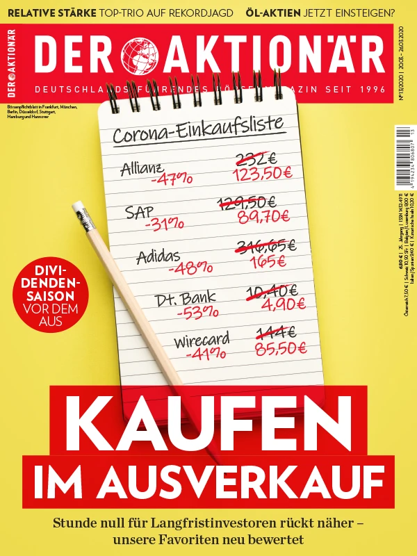 Dennoch wurden auch viele Unternehmen mit krisensicheren Geschäftsmodellen in den Strudel der Corona-Abwärtsspirale hineingezogen. Diese Unternehmen sind jetzt mit deutlichen Abschlägen zu haben und sollten auf dem Einkaufszettel jedes Anlegers stehen. DER AKTIONÄR hat in der neuen Ausgabe aussichtsreiche Titel analysiert und auf die Liste gesetzt. Damit Sie in Kürze großzügig shoppen gehen können.