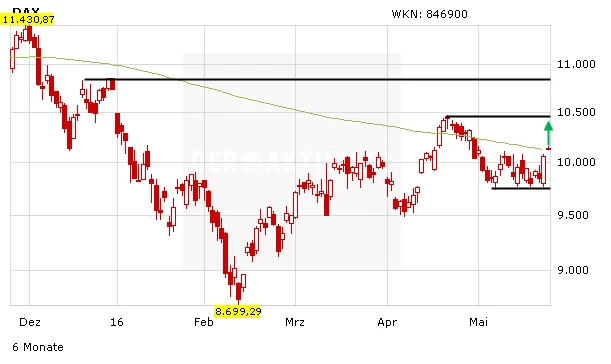 Mit dem nachhaltigen Sprung über die 200-Tage-Linie (akt. bei 10.121 Punkten) würde ein frisches Kaufsignal generiert. Als nächstes Ziel wartet das Hoch vom 21. April bei 10.747 Zählern. Im Anschluss könnte der Leitindex aus charttechnischer Sicht Kurs auf das Hoch vom Jahreswechsel bei 10.860 Punkten nehmen. Mit dem DAX Mini-Long (WKN CW9W4N) von der Citigroup können Anleger auf dieses Szenario setzen.