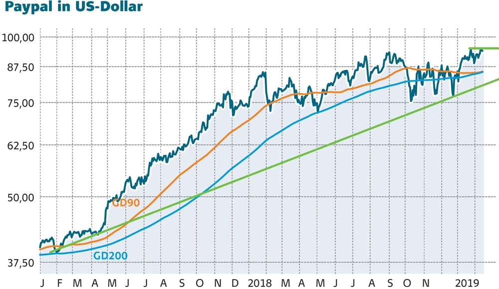 Die Paypal-Aktie hat sich nach den nicht so berauschenden Zahlen für 2018 wieder berappelt und ist nur einen Hauch vom Rekordhoch entfernt. Gelingt das Break, wäre dies ein starkes Kaufsignal. AKTIONÄR-Leser, die der Empfehlung vor drei Jahren gefolgt sind, liegen nun 150 Prozent vorne. Laufen lassen.