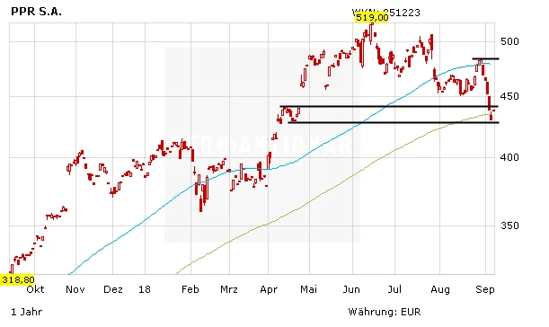 Der französische Luxusgüter-Konzern Kering hatte im August gute Halbjahreszahlen präsentiert. Doch die Börse reagierte enttäuscht. Die Kering-Aktie rutschte von 487 bis auf 430 Euro ab. Nun sollte die Korrektur beendet sein.