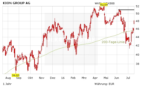 Gut aufgenommen wurde an der Börse auch die Bestätigung des Konzernausblicks für das laufende Geschäftsjahr. In der Periode geht Kion von einem Umsatz zwischen 5,35 Milliarden Euro und 5,50 Milliarden Euro aus. Für das EBIT wird ein Wert in der Range von 510 Millionen Euro und 535 Millionen Euro erwartet. Zuversichtlich stimmt ebenfalls der Auftragseingang, der von April bis Juni um 8,3 Prozent auf 1,43 Milliarden Euro stieg. Die kürzlich erfolgte Übernahme von Dematic, einem führenden Hersteller intelligenter Intralogistik Lösungen, ist in den Prognosen noch gar nicht berücksichtigt. Kion-Vorstandsvorsitzender Gordon Riske will durch den erfolgten Zukauf weiterhin vom anhaltenden Trend Industrie 4.0, der in der Logistikbranche Einzug hält, profitieren.