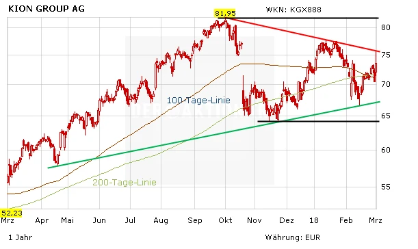 Kion kündigte an, die Dividende auf 0,99 Euro je Aktie zu erhöhen - ein Plus von 24 Prozent im Vergleich zum Vorjahr (0,80 Euro). Hauptprofiteur der Dividenden-Erhöhung ist der chinesische Großaktionär Weichai, der gut 43 Prozent an Kion hält. Bis Ende Juni solle diese Quote nicht erhöht werden, danach dürfte der Anteil weiter aufgestockt werden. Die US-Bank JP Morgan hat Kion auf "Overweight" mit einem Kursziel von 80,50 Euro belassen.