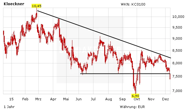 Aus charttechnischer Sicht ist die Klöckner-Aktie weiterhin sehr schwach. Zum einen ist der langfristige Abwärtstrend weiterhin intakt. Zum anderen ist die horizontale Unterstützung bei 7,60 Euro vorerst gerissen. Die Dreiecksformation, die sich zuletzt gebildet hatte, wurde damit ebenfalls nach unten verlassen. Fällt der Titel nun auch unter das Jahrestief bei 6,90 Euro, wartet als letzte Unterstützung nur noch die 6,50-Euro-Marke. Darunter droht sogar der freie Fall in Richtung des Allzeittiefs bei 4,39 Euro.