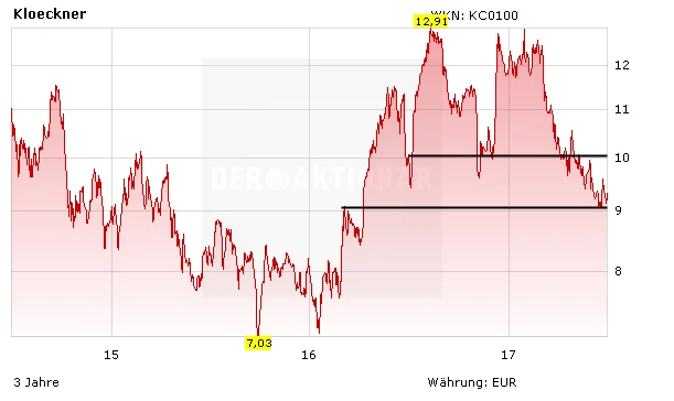 Trotz der guten Aussichten kommt die Aktie noch nicht von der Stelle. Doch es wäre nicht das erste Mal in der jüngsten KlöCo-Historie, dass es zu einem plötzlichen und vor allem rasanten Stimmungsumschwung kommt. Risikobewusste Anleger könnten deshalb eine Spekulation auf ein Comeback der KlöCo-Aktie starten und auf dem aktuellen Niveau einen Fuß in die Tür stellen. Oberhalb der 10-Euro-Marke kann diese Position dann sogar noch einmal ausgebaut werden. Ein Stopp bei 8,75 Euro sichert nach unten ab.