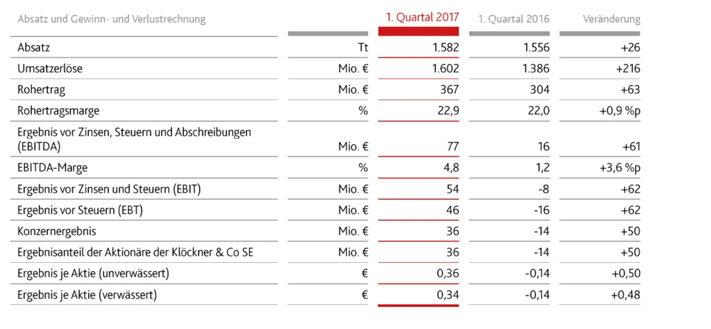 Neben einem verbesserten Preisumfeld machten sich in den ersten drei Monaten 2017 auch mehr und mehr die Effekte aus Restrukturierungs- und Optimierungsmaßnahmen im Zahlenwerk positiv bemerkbar. Ergebnis: das beste Quartalsergebnis seit sechs Jahren. Auch für das laufende zweite Quartal stellt der Vorstand eine robuste Ergebnisentwicklung in Aussicht. Damit dürfte der SDAX-Konzern im Gesamtjahr bei steigenden Umsätzen seinen Gewinn spürbar steigen. Ebenfalls positiv: Die KlöCo-Aktie wird derzeit rund ein Viertel unter ihrem Buchwert gehandelt.