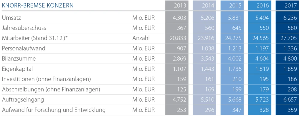 Knorr-Bremse bietet für seine Kunden Brems- und Subsysteme in den beiden Geschäftssparten Schienenfahrzeuge und Nutzfahrzeuge an. Im Jahr 2017 konnte das Münchner Unternehmen einen Konzernumsatz von rund 6,24 Milliarden Euro, bei einem EBITDA von 580 Millionen Euro realisieren.