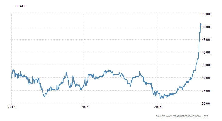 Mit dieser rasant steigenden Nachfrage kann das Angebot nicht mithalten, weil es ähnlich wie bei Lithium sehr lange dauert, neue Fördergebiete zu erschließen und in Produktion zu bringen. Bei Kobalt kommt erschwerend hinzu, dass über die Hälfte des weltweit geförderten Kobalts aus dem Kongo kommt und dort zum Teil unter sehr zweifelhaften Methoden abgebaut wird. Es ist davon auszugehen, dass nicht wenige Hersteller ihr Kobalt aus Imagegründen nicht aus dem Kongo beziehen werden.