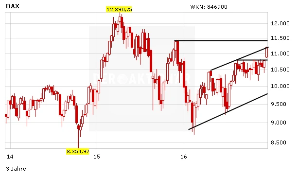 Technisch betrachtet hatte der DAX mit jüngsten Sprung über die Marke von 10.800 Punkten ein massives Kaufsignal generiert. Dies erklärt auch den starken Anstieg nach dem Überwinden des Widerstands. Nachdem auch die 11.000-Punkte-Marke überwunden wurde, hat sich der deutsche Leitindex ein Anschlusspotenzial bis zum 53-Wochen-Hoch bei 11.431 Zählern freigeschaufelt.